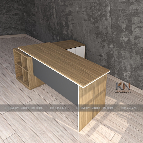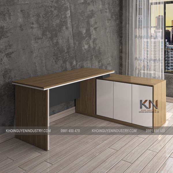 Bàn Giám Đốc BGD-KN-04 được làm bằng gỗ công nghiệp MDF phủ melamine hạn chế trầy xước dễ dàng lau dọn, vệ sinh. Bàn có tủ phụ kèm theo.