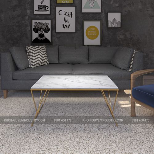 3.Chất liệu: Chân sắt sơn nhũ vàng, mặt bàn đá trắng