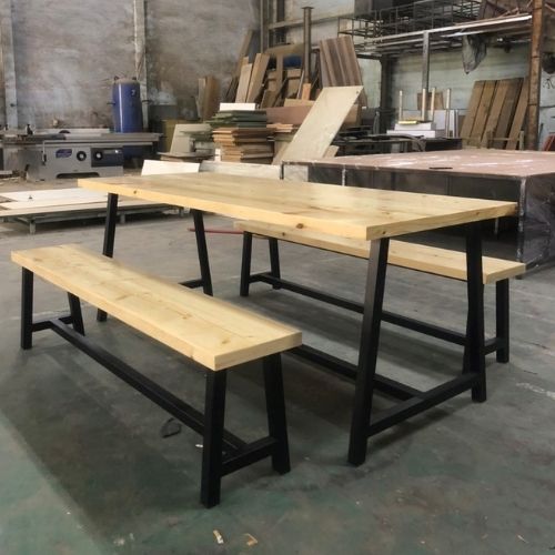 CHẤT LIỆU: Chân sắt sơn tĩnh điện đen, mặt bàn ghế gỗ thông