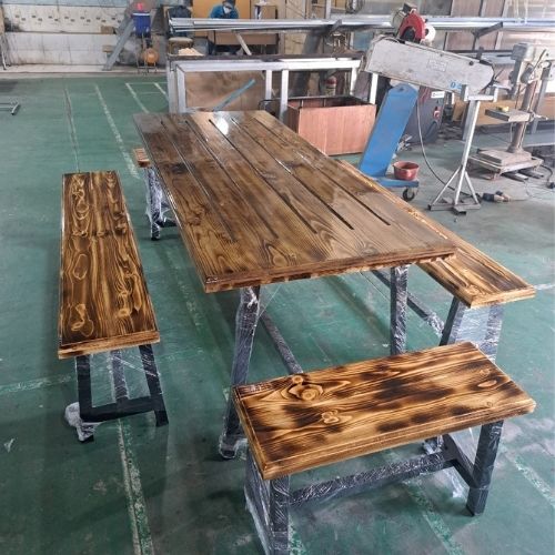3.Chất Liệu: Chân sắt sơn tĩnh điện, mặt bàn ghế gỗ thông