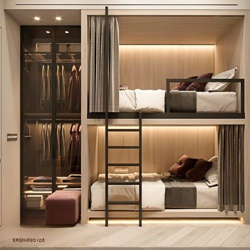 Giường tầng kết hợp với tủ đựng quần áo, tối ưu không gian căn phòng, cùng với thiết kế tone màu nóng, tạo cảm giác ấm áp.