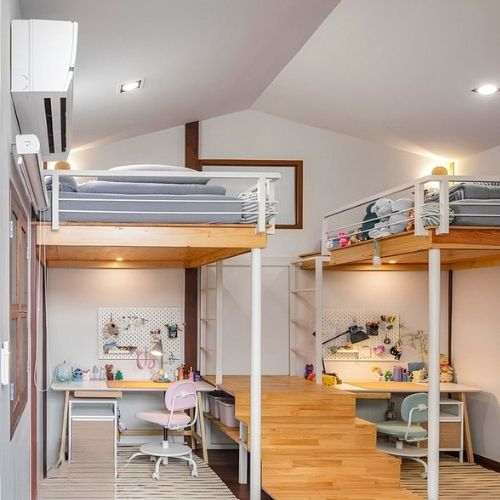 Mỗi tầng giường được thiết kế kèm 2 bộ bàn ghế học tập cho bé, có lối cầu thang ở giữa, vận dụng khoảng trống dưới cầu thang để cất đồ chơi, đồ dùng học taajo cho bé.