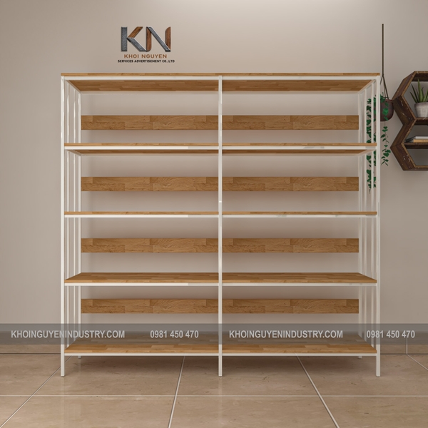 - Kệ được kết hợp giữa khung sắt sơn trắng và màu gỗ tự nhiên giúp cho không gian thêm hiện đại